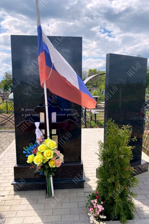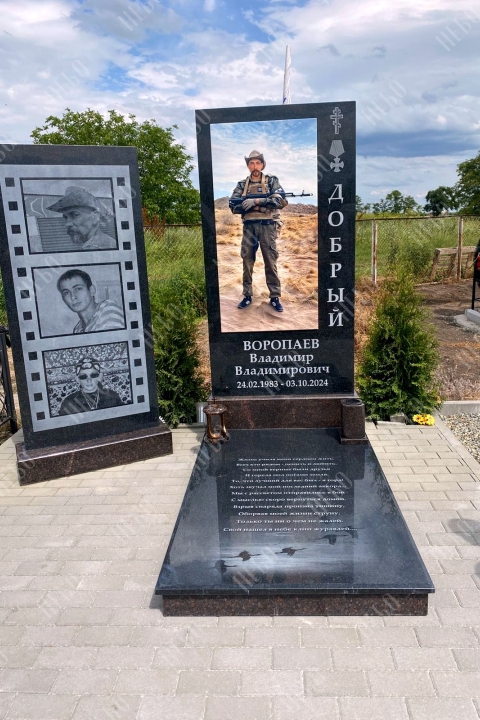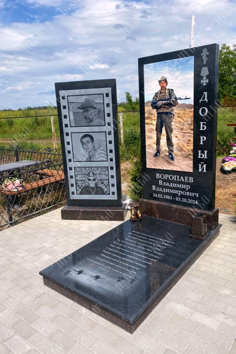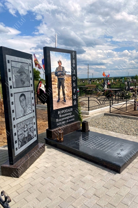 Прямоугольный ростовой памятник для военного с фотографией на металлокерамике. Рядом с памятником установлена дополнительная декоративная гранитная стела.
